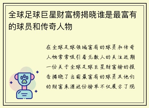 本文将回顾全球传奇足球明星的辉煌成就,探讨他们在足球历史上的重要地位。我们将从四个方面进行详细阐述:首先,介绍几位代表性的传奇球星,包括他们的职业生涯和个人荣誉;其次,分析这些球员对球队和国家队的重要贡献;接着,探讨他们在推广足球运动及影响力方面的作用;最后,总结这些球员如何激励了新一代的年轻球员。通过这些内容,我们希望能全面展现全球传奇足球明星的光辉历程与卓越成就。 1、传奇球星介绍 在世界足...