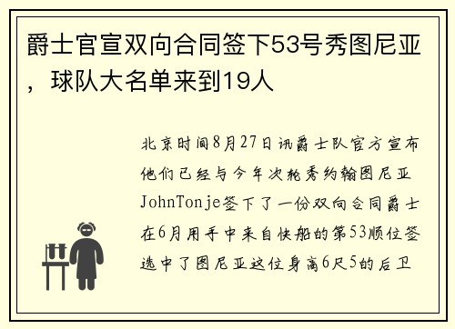 爵士官宣双向合同签下53号秀图尼亚,球队大名单来到19人