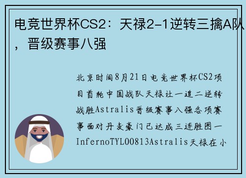 电竞世界杯CS2:天禄2-1逆转三擒A队,晋级赛事八强