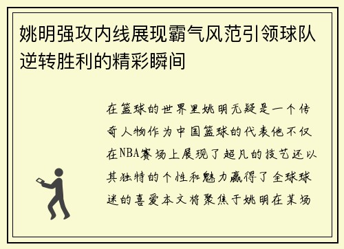 姚明强攻内线展现霸气风范引领球队逆转胜利的精彩瞬间